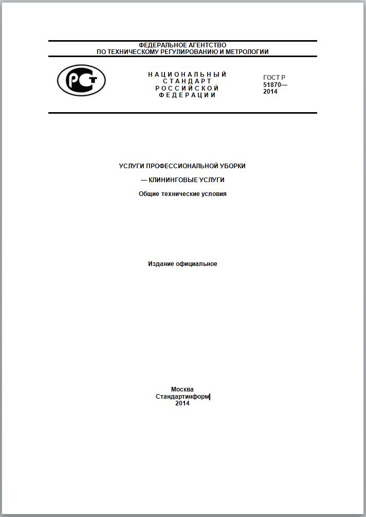 Согласно Приказа руководителя Росстандарта от 11.11.2014, новый национальный стандарт ГОСТ Р 51870—2014 «УСЛУГИ ПРОФЕССИОНАЛЬНОЙ УБОРКИ — КЛИНИНГОВЫЕ УСЛУГИ. Общие технические условия» будет введён в действие 01 июля 2015 года после официальной публикации, однако им уже можно воспользоваться в работе, поскольку текст доступен для Вас.