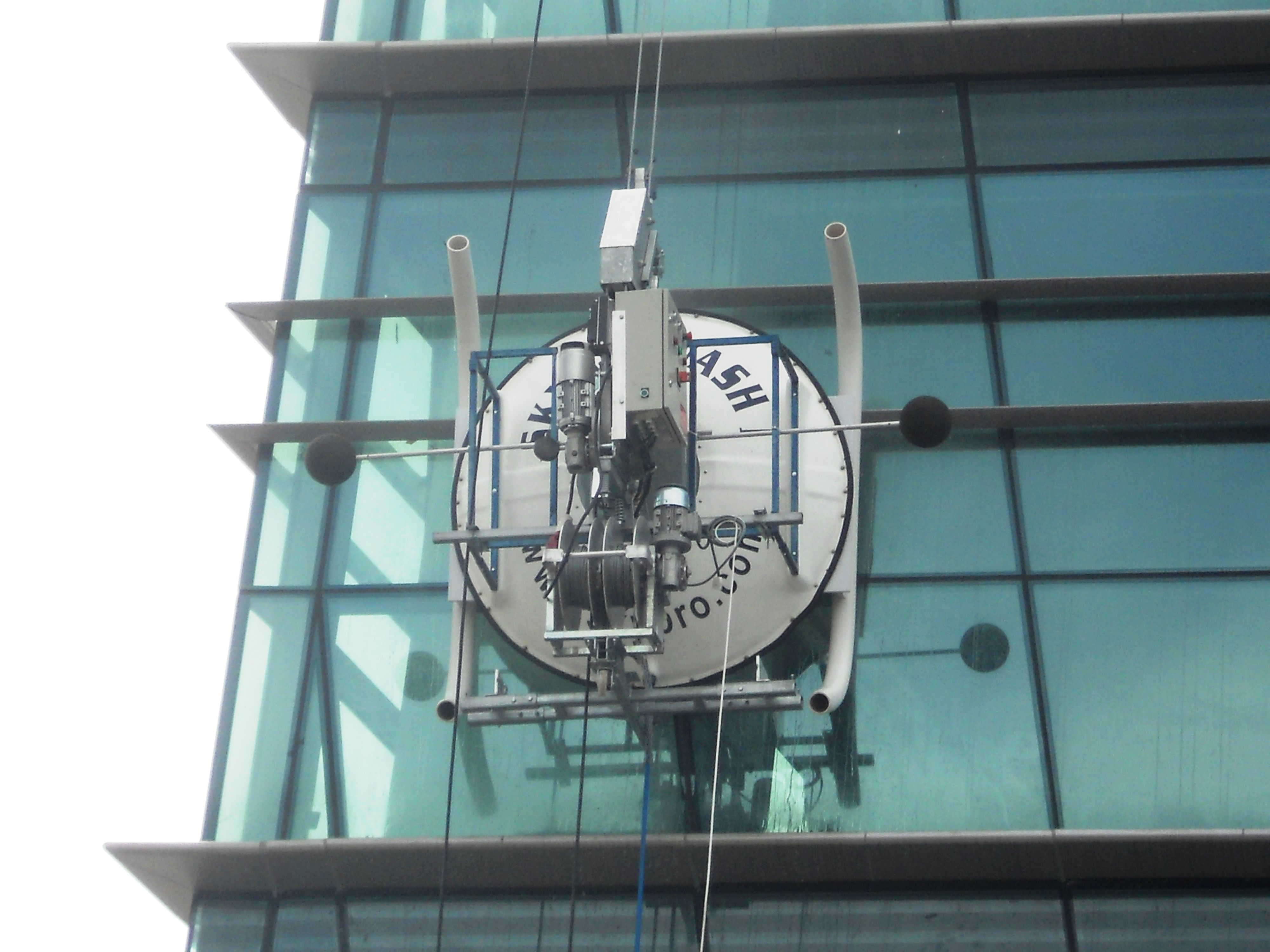 The Skydrowasher High Pressure Window Washing System cleans a high-rise building’s windows and exterior using high pressure water to scrub the surface from a distance of up to 3 feet. Skydrowasher is ideal for cleaning buildings with irregular architectural features that make traditional cleaning methods difficult or costly. The unit uses only water pressure to move and cleans 9,000-13,000 square feet per hour. At only 250 pounds, the system eliminates the need for heavy-duty roof rigging.
