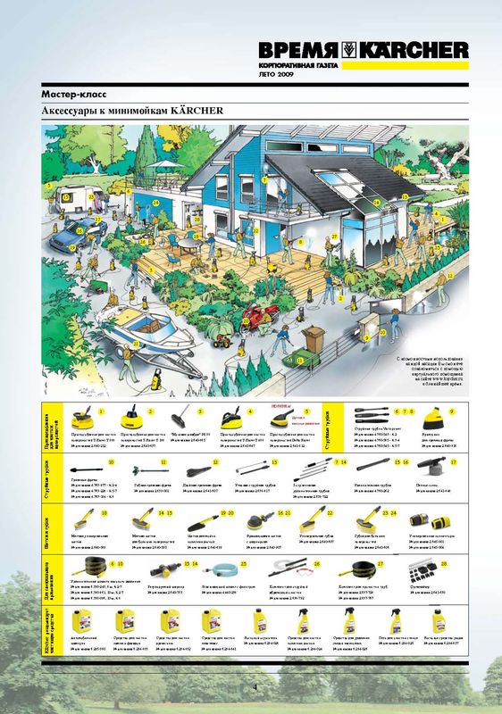 Краткий, но ёмкий визуальный справочник по применению насадок и аксессуаров к минимойкам Керхер.